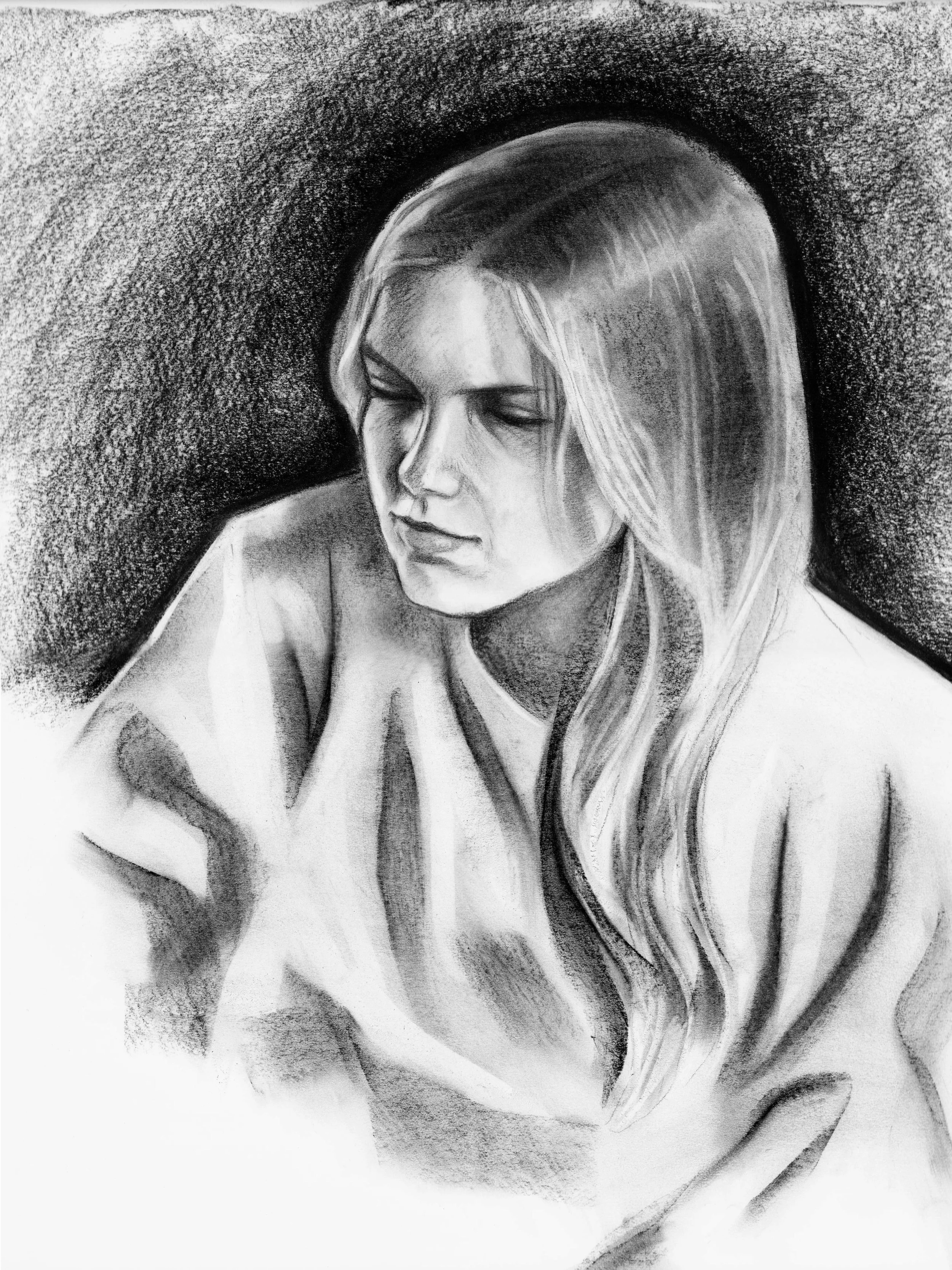 The second stage includes laying down the “value/shape block-in.” Here, I begin searching for the darkest shadows on the model. Next, I draw those shadows with a compressed charcoal stick. Afterwards, I smudge the charcoal across the entirety of the paper to darken the overall value of my subject (this will be important for later).
