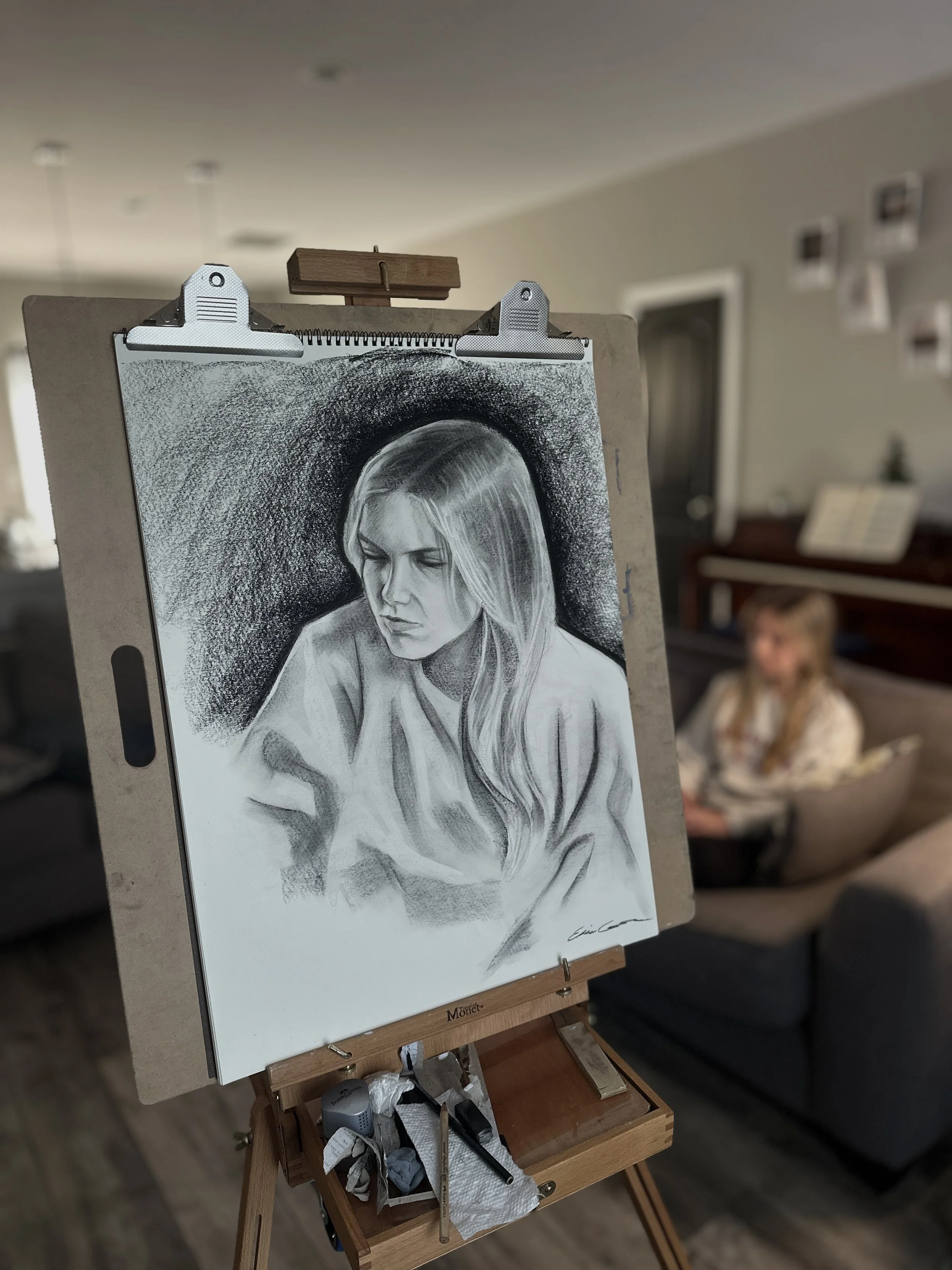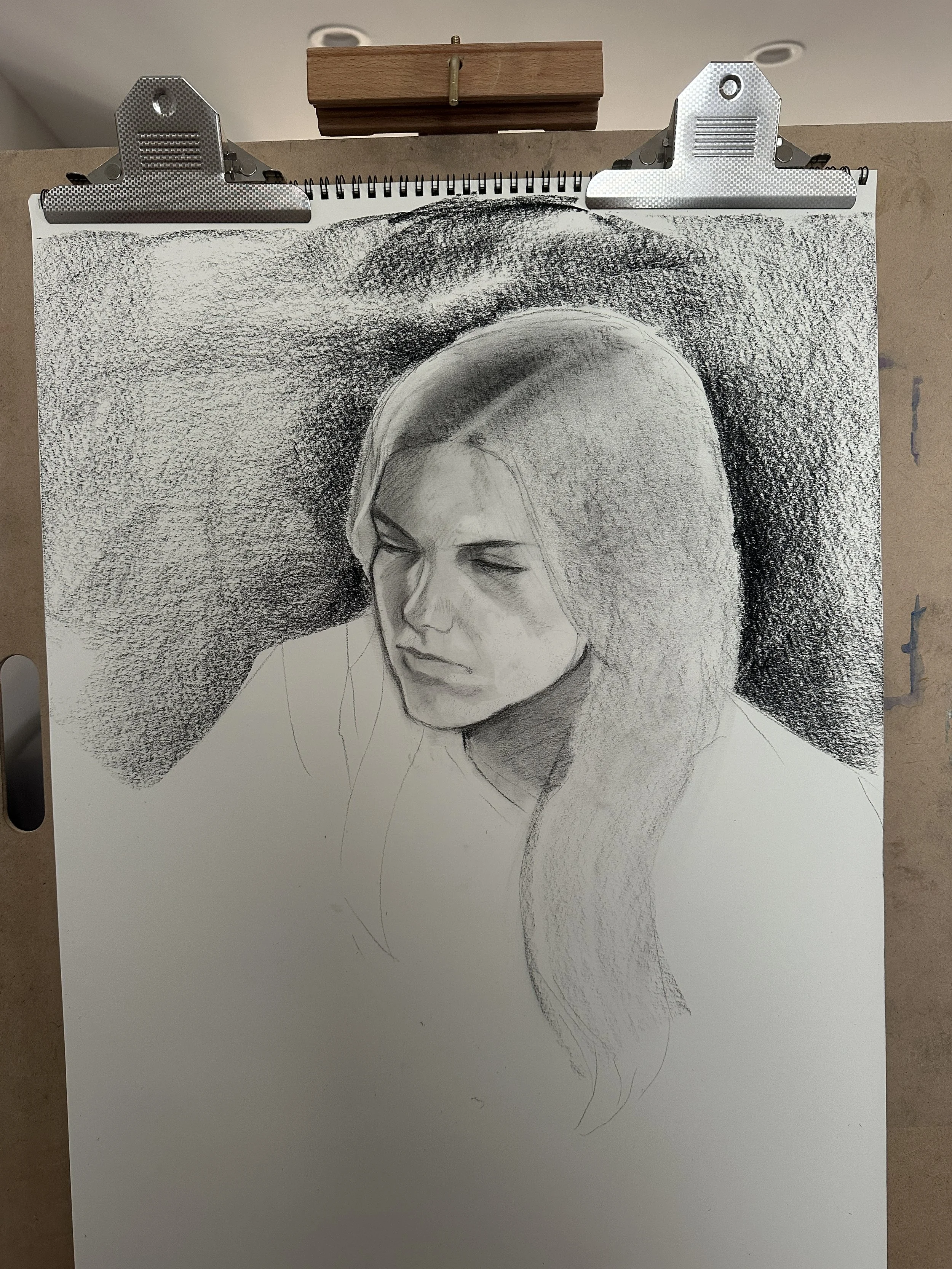 Preparation is a very important step when it comes to creating a successful piece of artwork. If the workspace around me is too cluttered, it could potentially lead to my workflow being inefficient. Therefore, preparing my easel is typically the first step of the process. During this session, I setup a French Easel and attached my drawing paper to the clip. Next, I sharped my charcoal pencils and laid out the compressed charcoal sticks. From here, I made sure to set my erasers and eraser pencils to the side (I like to use these tools to create highlights within my drawings. As a side note, eraser pencils are my favorite drawing tool).