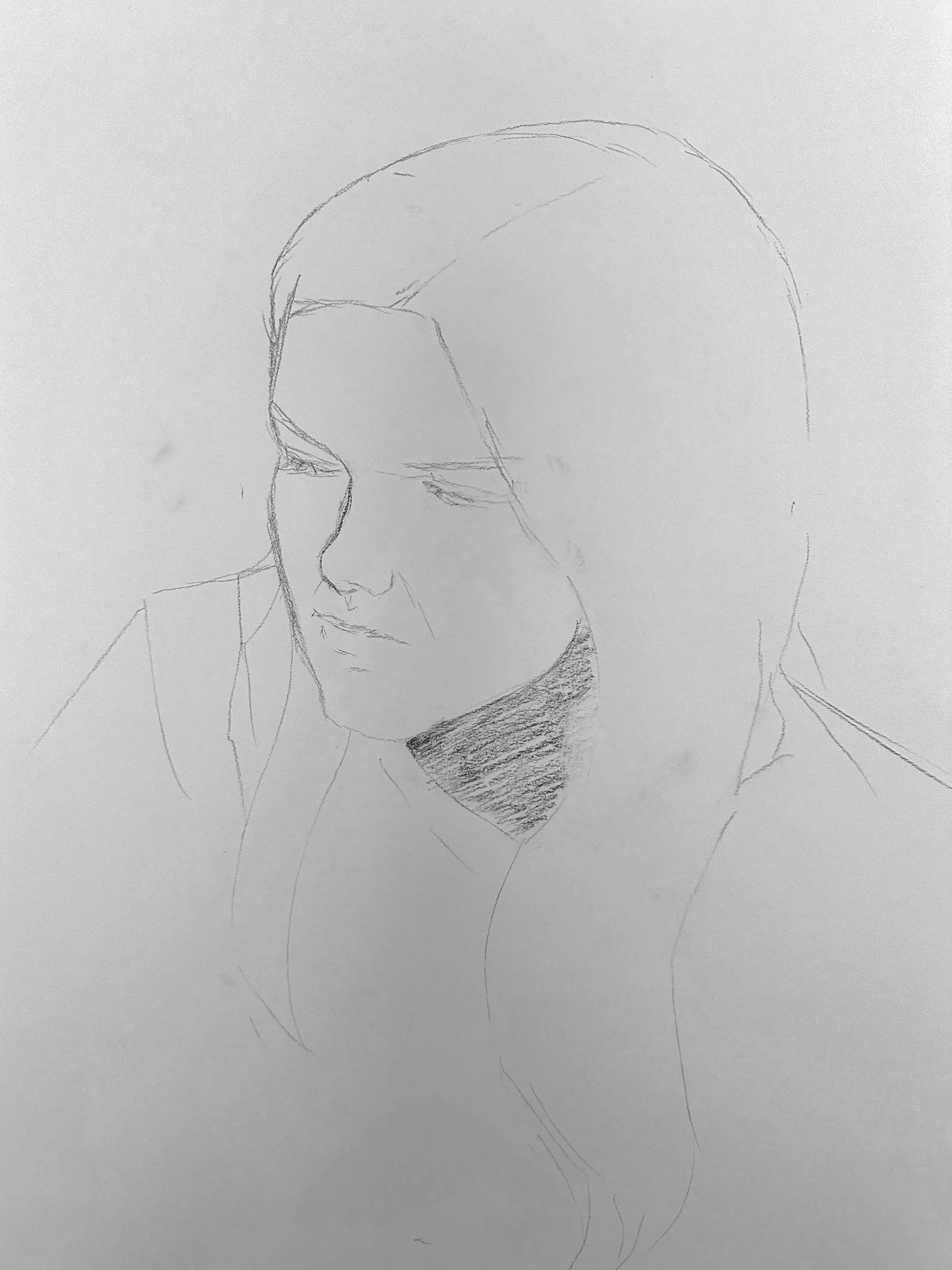Once the logistical items are in place, I am ready to begin drawing! This specific process is broken up primarily into three distinct stages. The first stage is creating the “linear sketch.” During this phase, I observe the model’s facial proportions by employing sight-measuring techniques and by observing plumb lines. This is the most essential drawing stage. If the measurements are recorded wrong during this seemingly basic step, then the whole project will be distorted by inaccurate proportions.