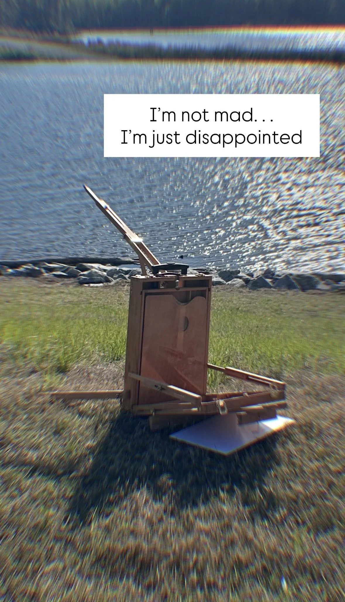 We eventually made it to an overlook at the lake and scoped out a good spot to begin setting up. I had the high expectations that this painting session would be poetic and that I’d feel like “a real artist.” Unfortunately, this wasn’t the case. Instead, my easel collapsed several times and broke, the wind kept blowing my hair into my face, I somehow inhaled several bugs, and I dropped my palette knife into goose poop.
