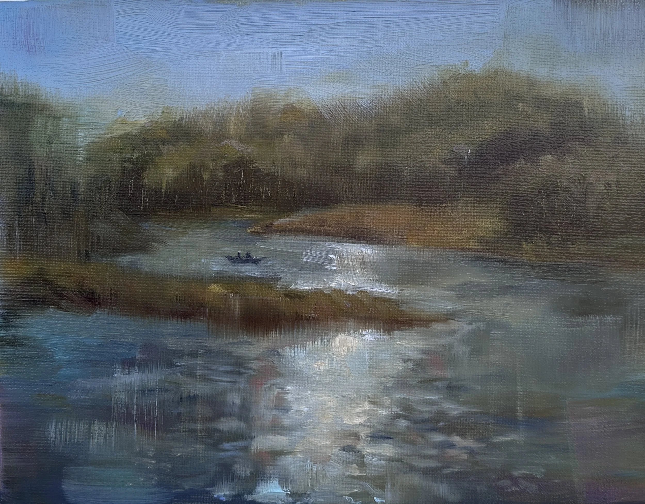 My goal for this session was to emphasize certain qualities about the setting, such as color and light, that stood out to me the most. To accomplish this, I covered the entirety of the canvas with a muted shade of green. Next, I sketched out the general layout of the setting with a thin layer of paint. From here, I painted the shimmering areas of sunlight reflected on the surface of the water and painted the overall shapes/values of the land; however, I was unsatisfied with the product of my work as every brushstroke felt too… ridged and stiff.