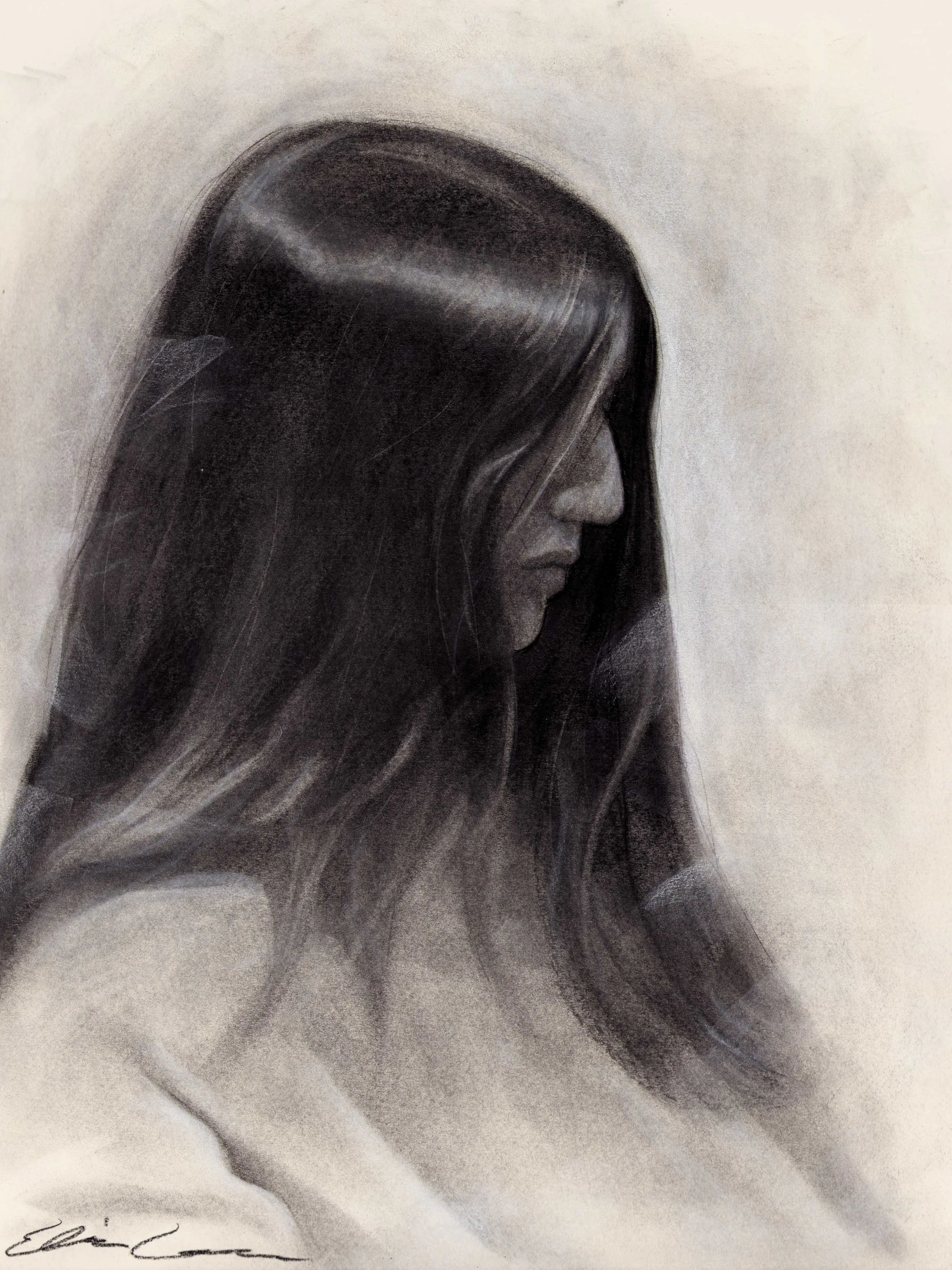 Next, I blocked in the most basic values. To accomplish this, I placed the deepest shadows and smudged the entire paper to create a midtone. Afterwards, I used my eraser to carve out the highlights. My end goal was to make the hair very expressive and to make the subject appear very mysterious.