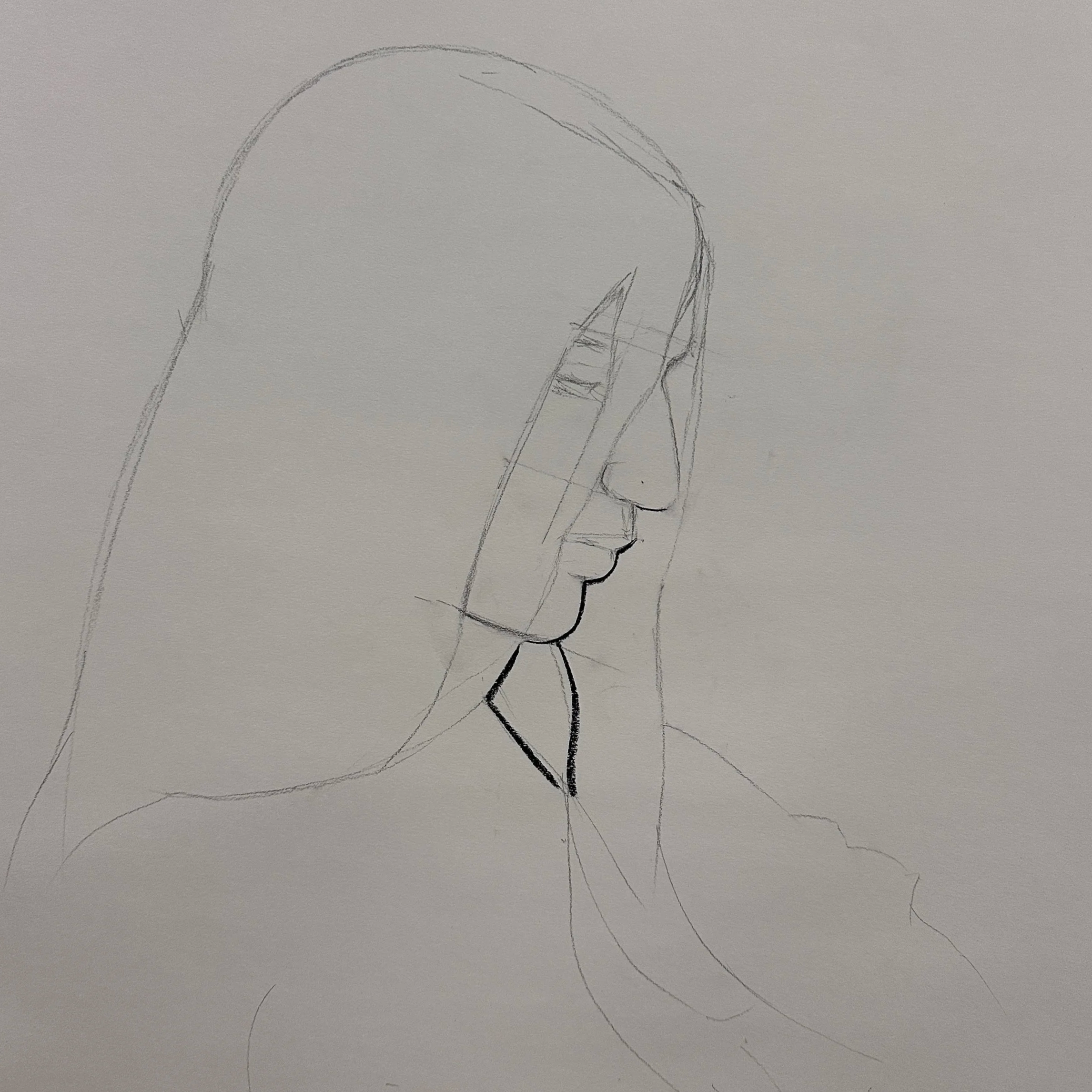 First, I began drawing the model’s side profile. I mapped out the basic proportions and then sketched the general facial features / shapes. As the session progressed, the model’s hair began to hide most of her facial features. As a result, I decided to make her hair the showcase of this drawing.