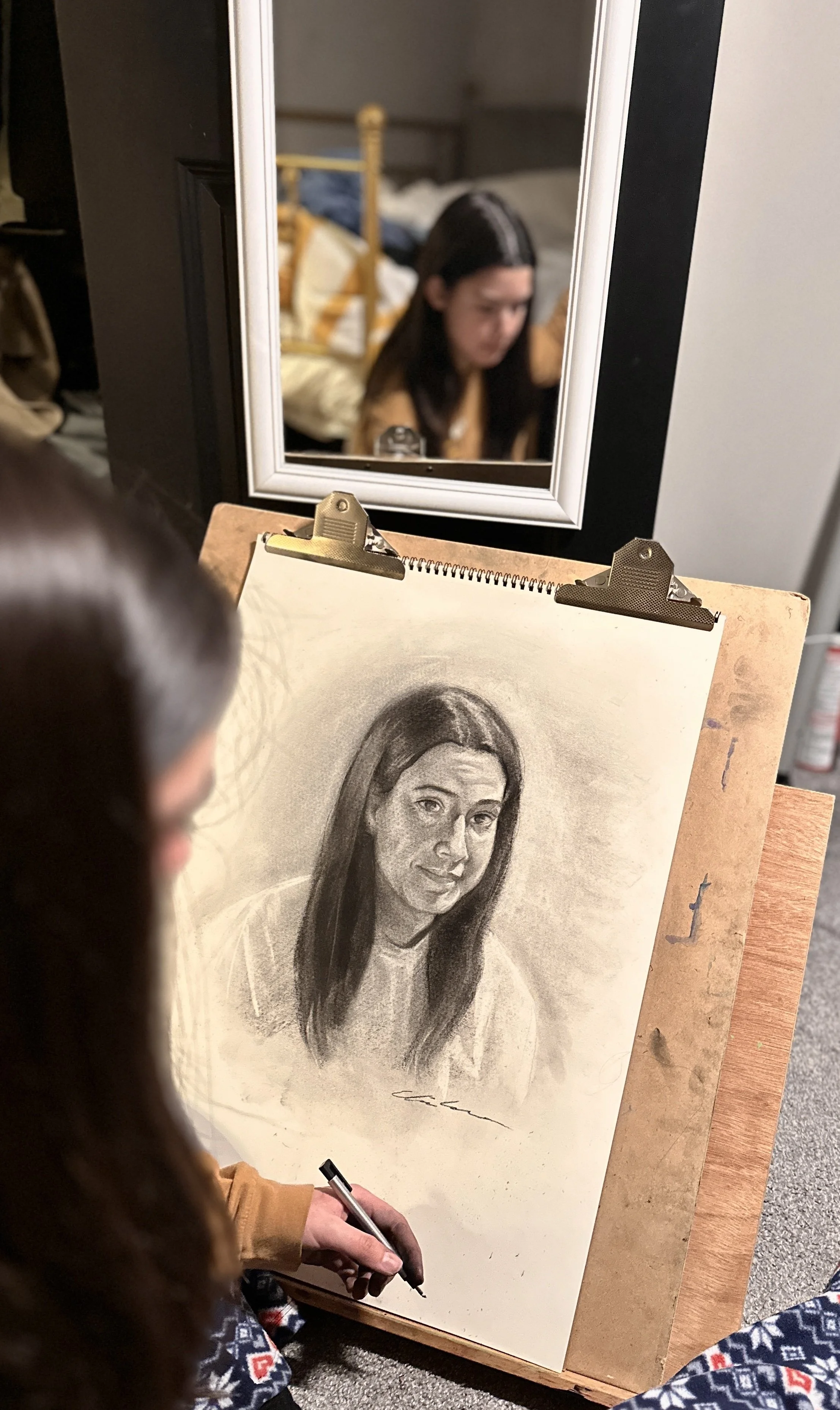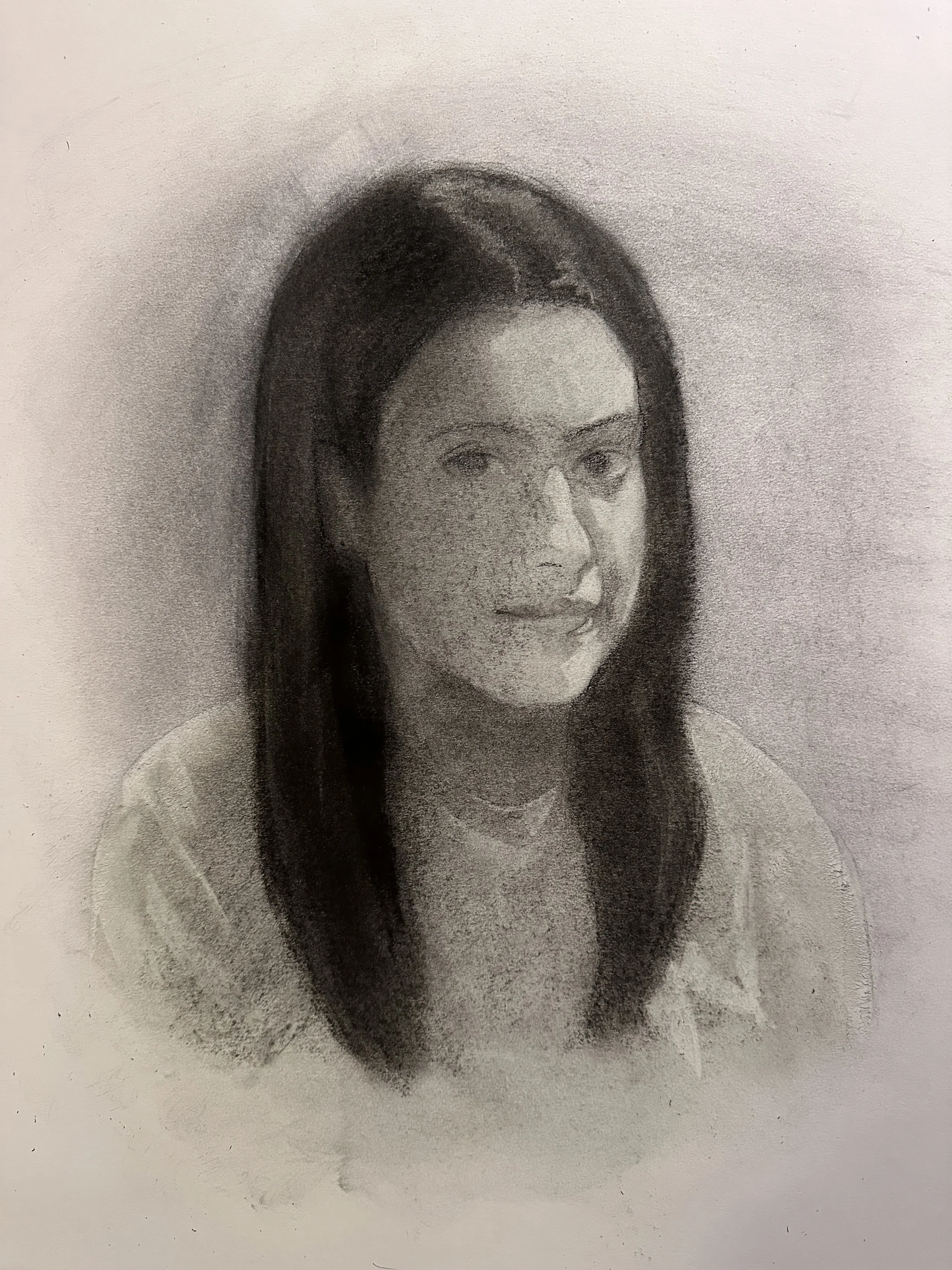 Another problem was that the subject just wouldn’t sit still (whoops, my bad). I knew doing a self-portrait would be challenging, but I didn’t realize it would be this difficult. Personally, that frustration of “not being good at something” made me want to do it even more. In the future, I will do another live self-portrait. However, I will likely use a desk mirror instead of a hanging mirror.